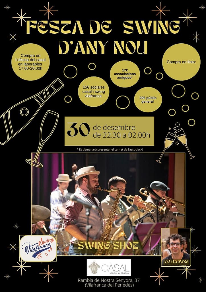 🎊La festa de pre Cap d'Any de Swing Vilafranca ja està aquí!🎊 El dissabte 30 de desembre podrem ballar amb la banda Swing Shot i el DJ Ramon de l'Associació...